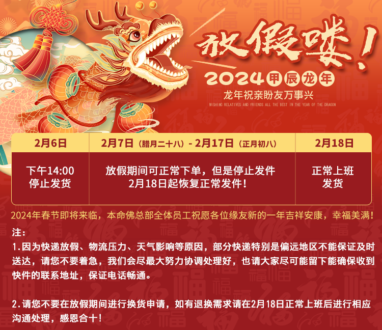缘友您好,本命佛总部于2月7日(腊月二十八)至2月17日(正月初八)春节放假,2月18日(正月初九)正常上班。年前发件截止2月6日下午14时,放假期间可以正常下单,将于2月18日正常上班后安排发出。因放假期间无人值守,如需查件可登录会员中心-订单管理,或直接点击这里快捷查件,可以根据单号联系快递公司,由此给您带来的不便,向您表示歉意!