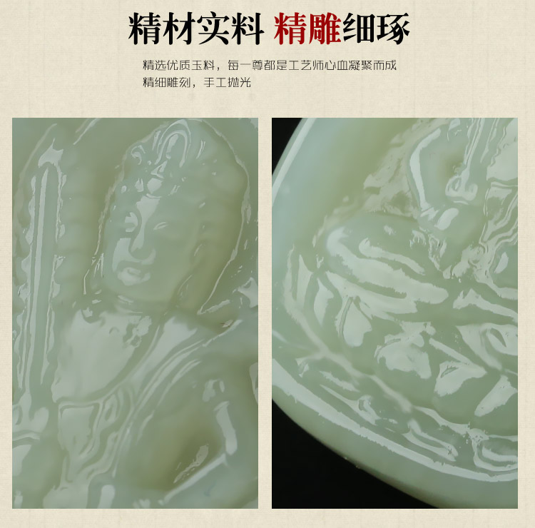 选用天然和田浅黄玉精雕而成,颜色浅黄到青绿不等,玉料干净,细腻温润,工艺精美、大方庄严,栩栩如生,富有灵气。