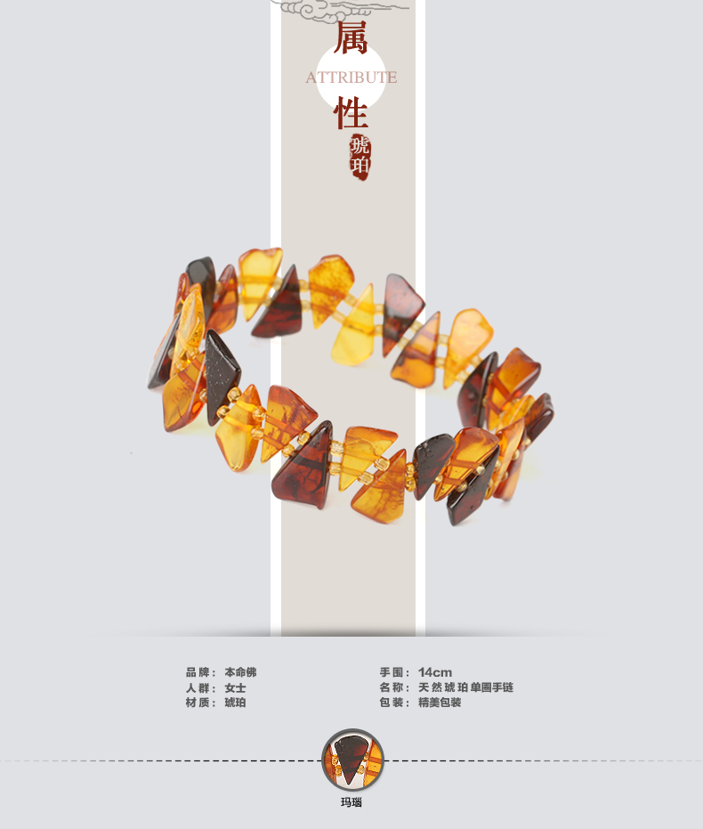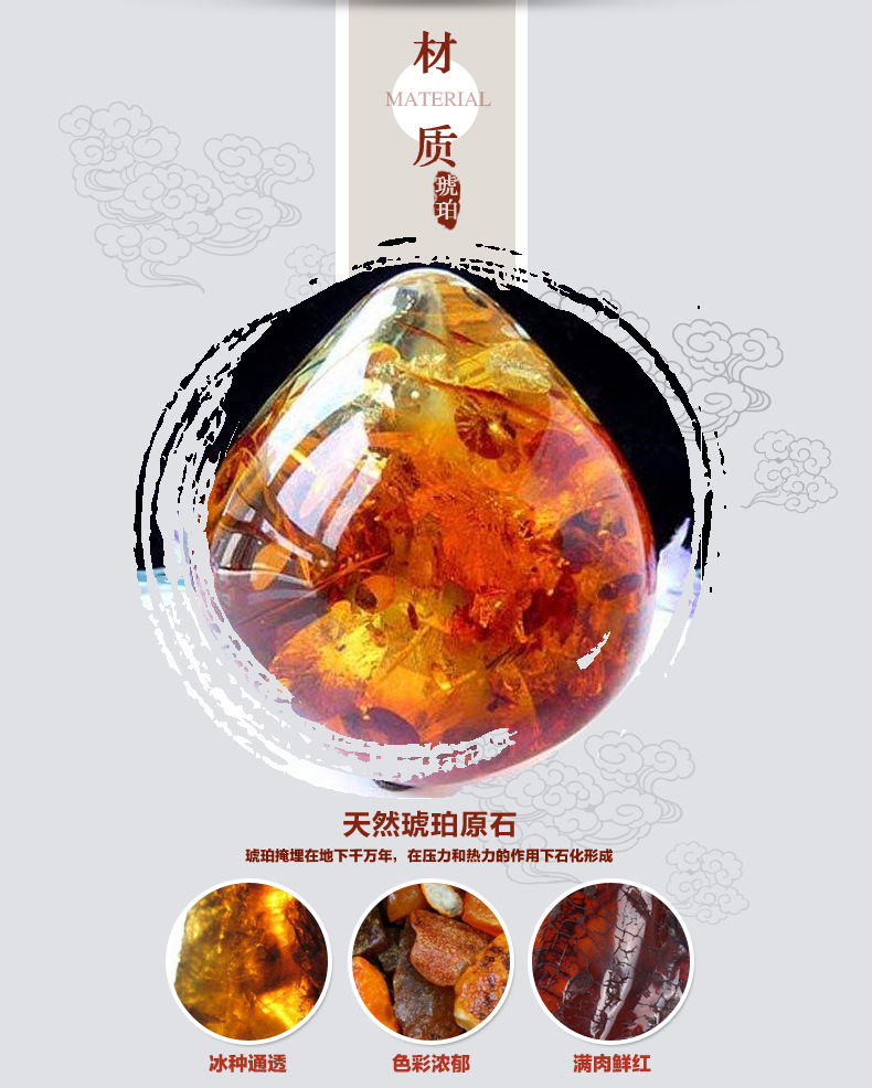 琥珀与金、银、琉璃、珊瑚、砗渠、玛瑙一起列为吉祥七宝。琥珀具有浑然天成的古朴庄重之美,温润中透出古典之气。它的色泽含蓄,质地温润,给人一种安详恬静的心灵感受。