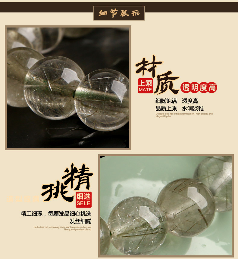 天然水晶晶体内可能会有棉絮、冰裂、矿缺,和打磨过程人为造成的硬伤,个别手链单珠可能会有微小悬殊,这就是我们所说的缺憾美。如同喜欢一个人一样,既然喜欢他(她)的优点,也要接收他(她)的缺点!人无完人,物无完物,更何况是经过亿万年形成的天然玉石呢。请大家了解天然水晶的这些特点,更好的爱护她!
