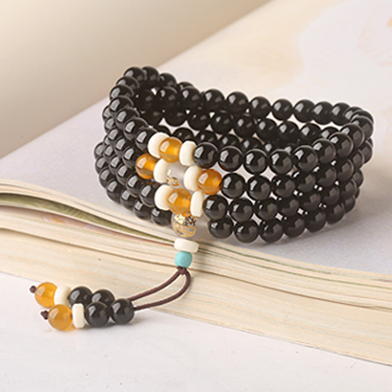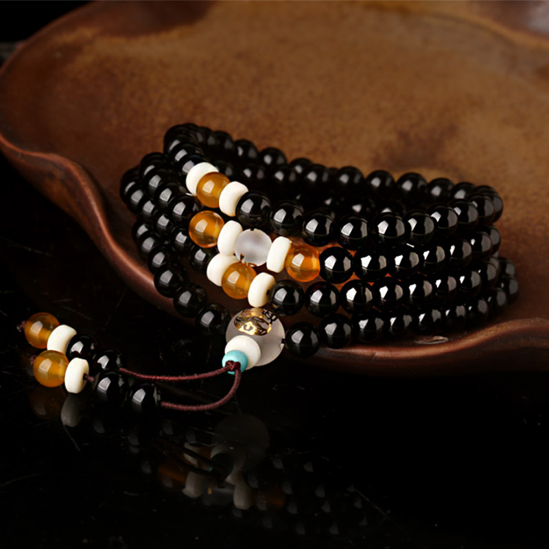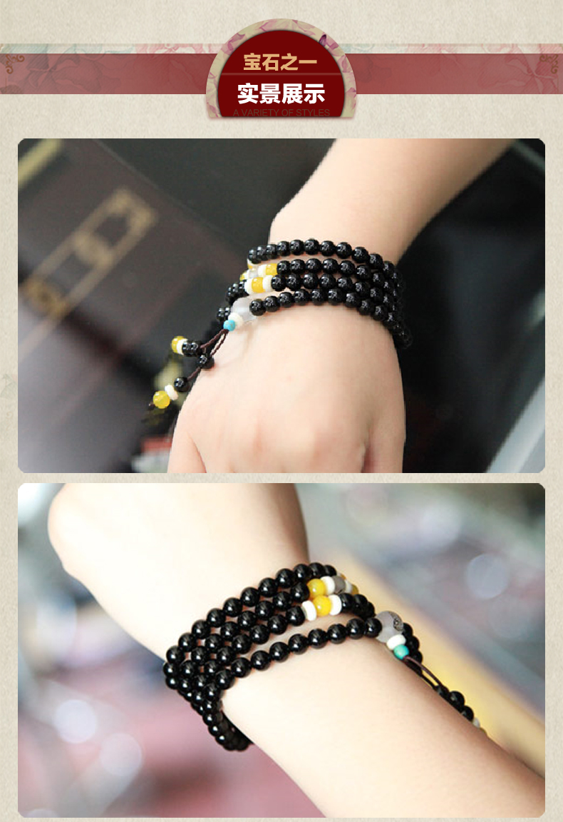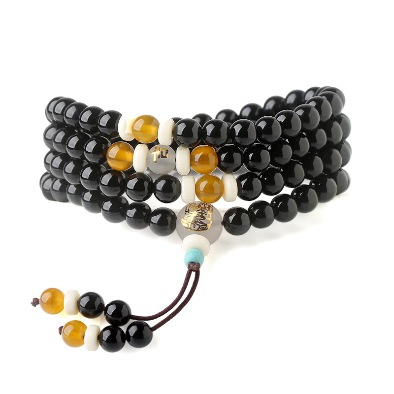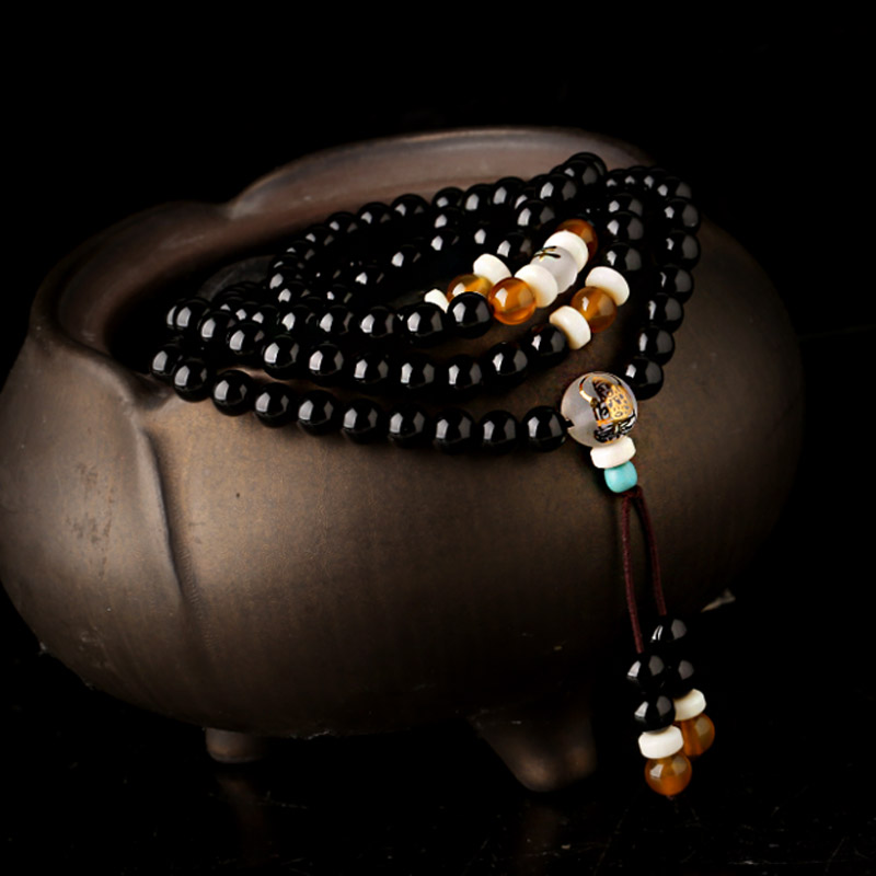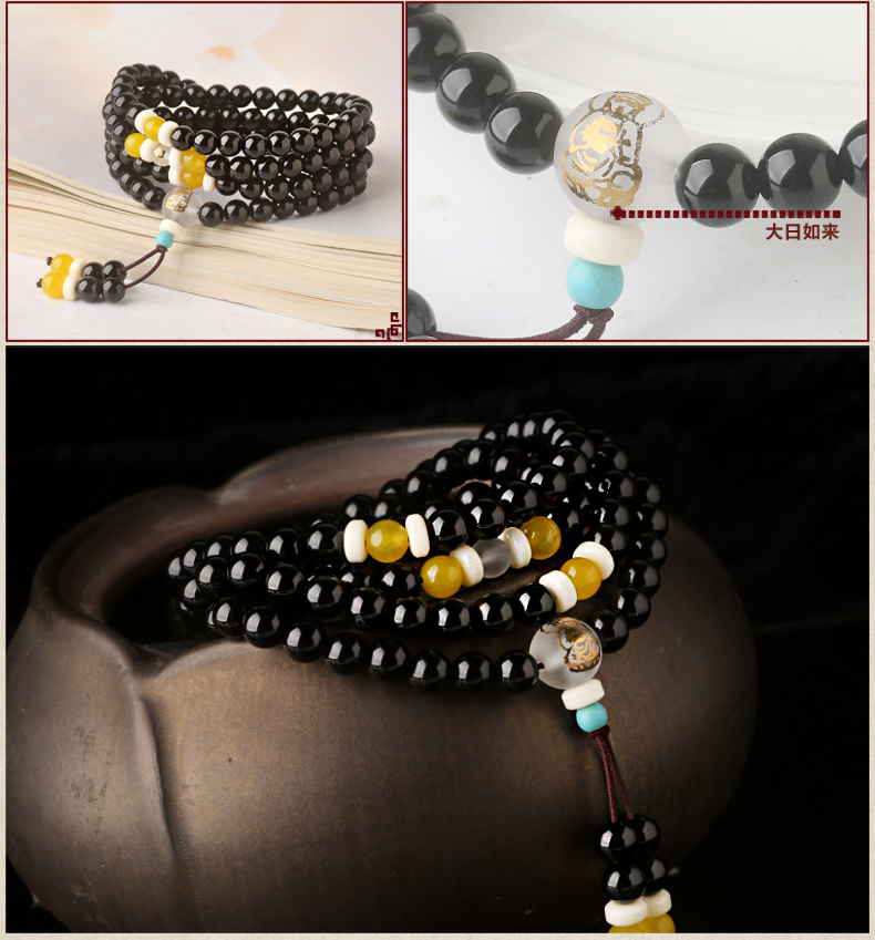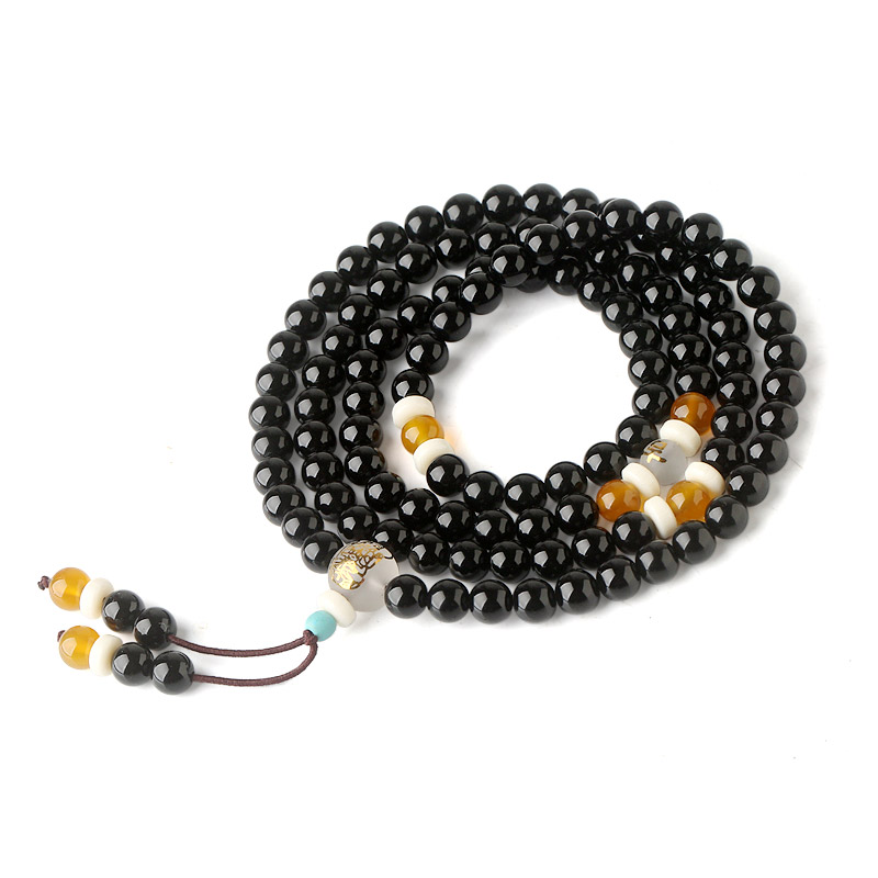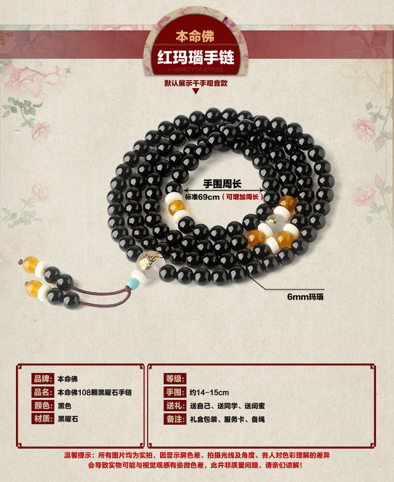 • 规格:黑曜石珠子直径约6MM,共108颗;白水晶隔珠直径约6MM