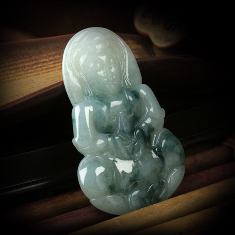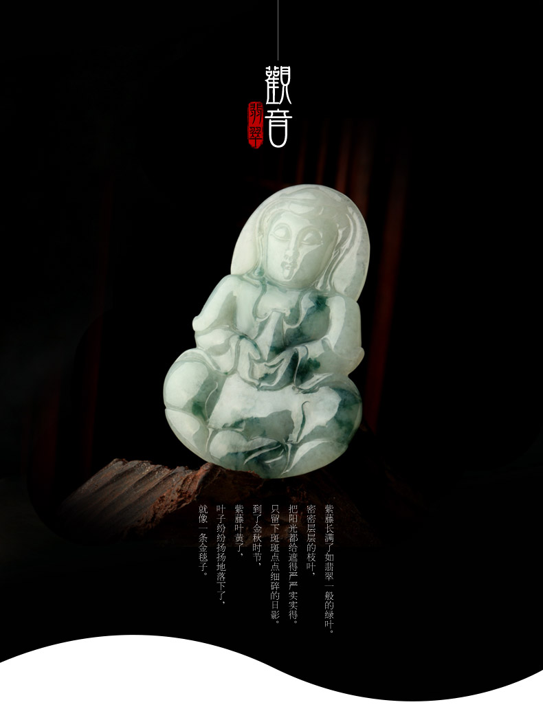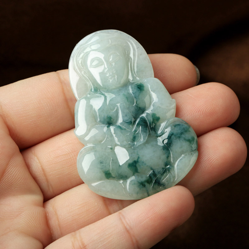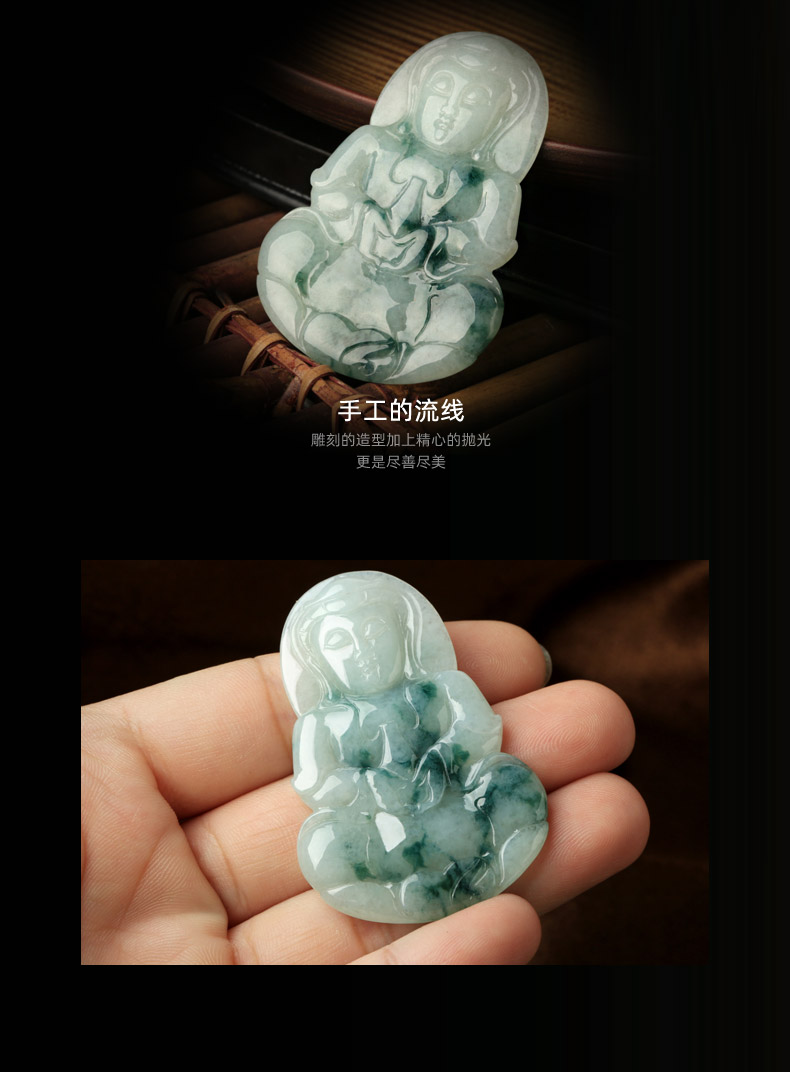 天然翡翠A货观音吊坠★冰糯种翡翠飘蓝花观世音菩萨挂坠