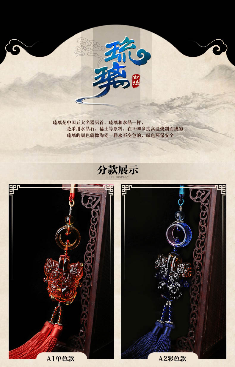 琉璃,其色彩流云丽彩、美轮美奂;其品质晶莹剔透、光彩夺目。琉璃是“吉祥七宝”之一、“中国五大名器”之首。采用彩色人造水晶烧制而成,其工艺繁复,需数十道工序,且以手工为主。因其“火里来,水里去”的工艺特点,人们将“形神如琉璃”视为修养的最高境界。在某种意义上说,明澈的琉璃寄托了人们的美好心愿。