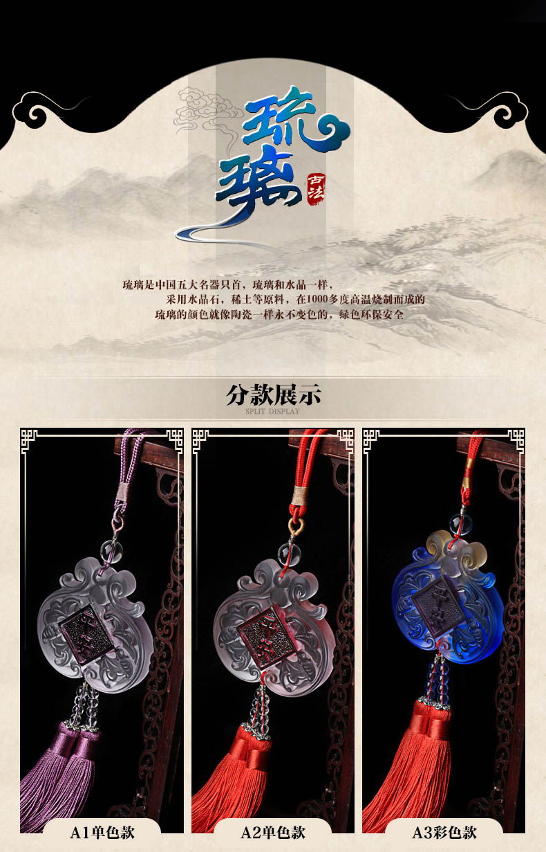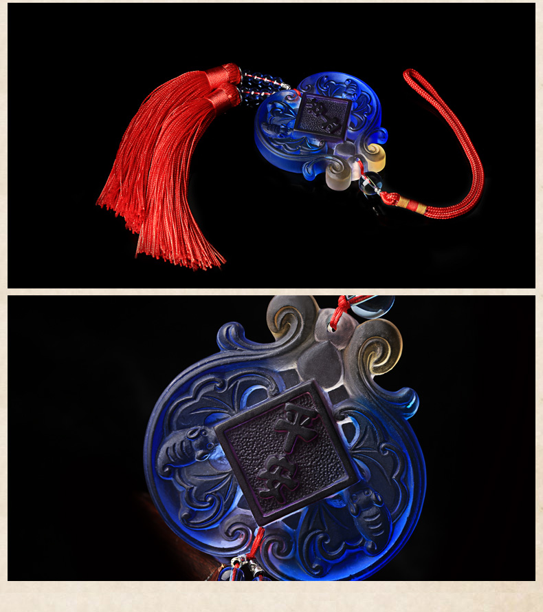 琉璃,其色彩流云丽彩、美轮美奂;其品质晶莹剔透、光彩夺目。琉璃是“吉祥七宝”之一、“中国五大名器”之首。采用彩色人造水晶烧制而成,其工艺繁复,需数十道工序,且以手工为主。因其“火里来,水里去”的工艺特点,人们将“形神如琉璃”视为修养的最高境界。在某种意义上说,明澈的琉璃寄托了人们的美好心愿。