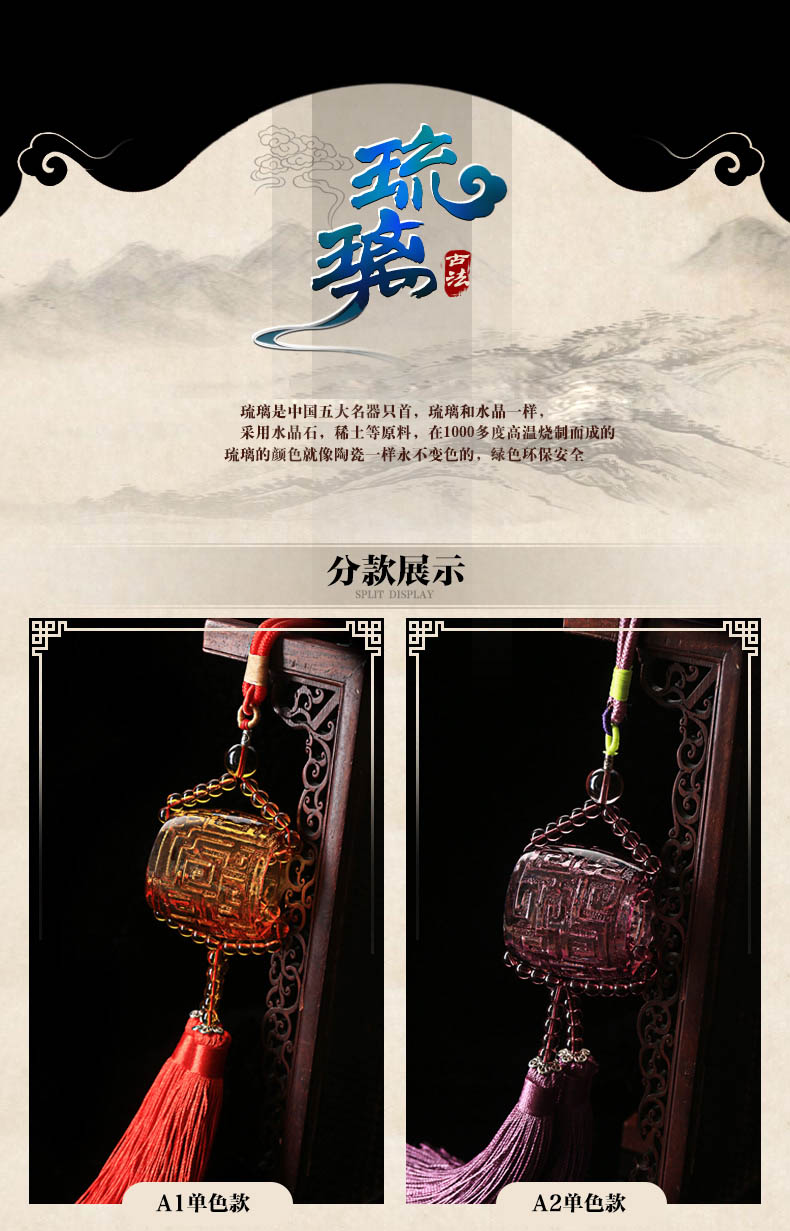 琉璃,其色彩流云丽彩、美轮美奂;其品质晶莹剔透、光彩夺目。琉璃是“吉祥七宝”之一、“中国五大名器”之首。采用彩色人造水晶烧制而成,其工艺繁复,需数十道工序,且以手工为主。因其“火里来,水里去”的工艺特点,人们将“形神如琉璃”视为修养的最高境界。在某种意义上说,明澈的琉璃寄托了人们的美好心愿。