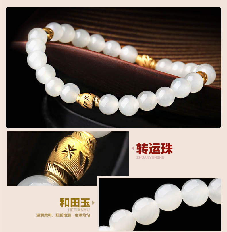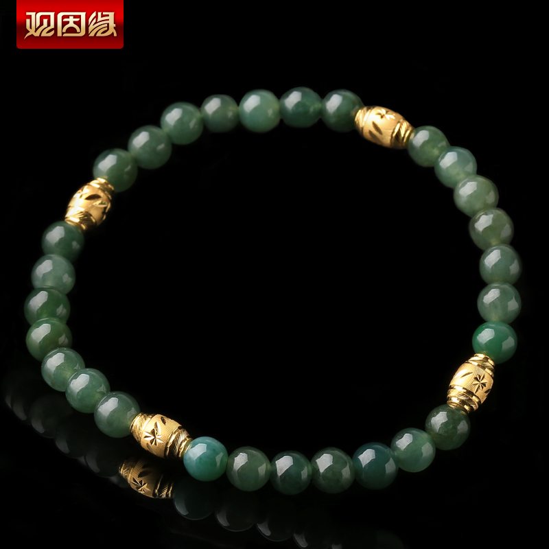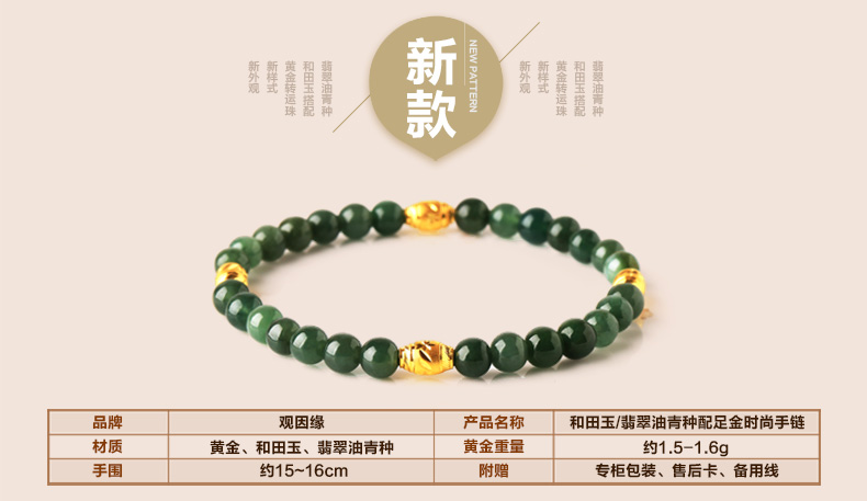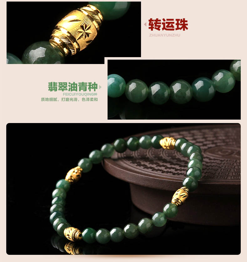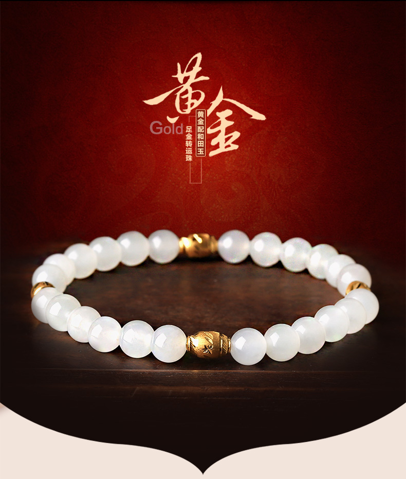 黄金足金3D硬金和田玉单圈手链★翡翠配黄金转运珠单圈手串★流行饰品