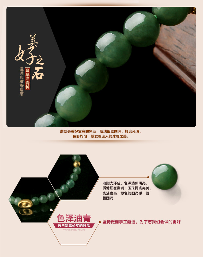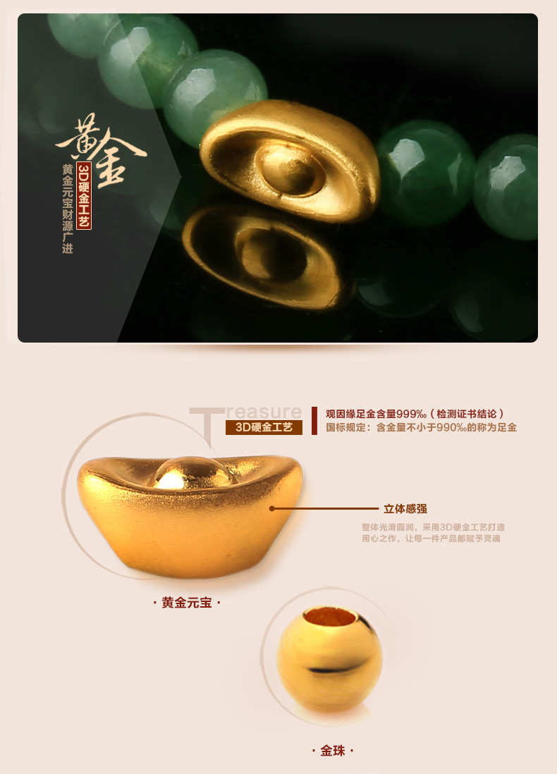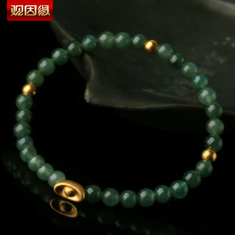 黄金3D硬金元宝翡翠单圈手链★翡翠油青种配足金手串★流行饰品