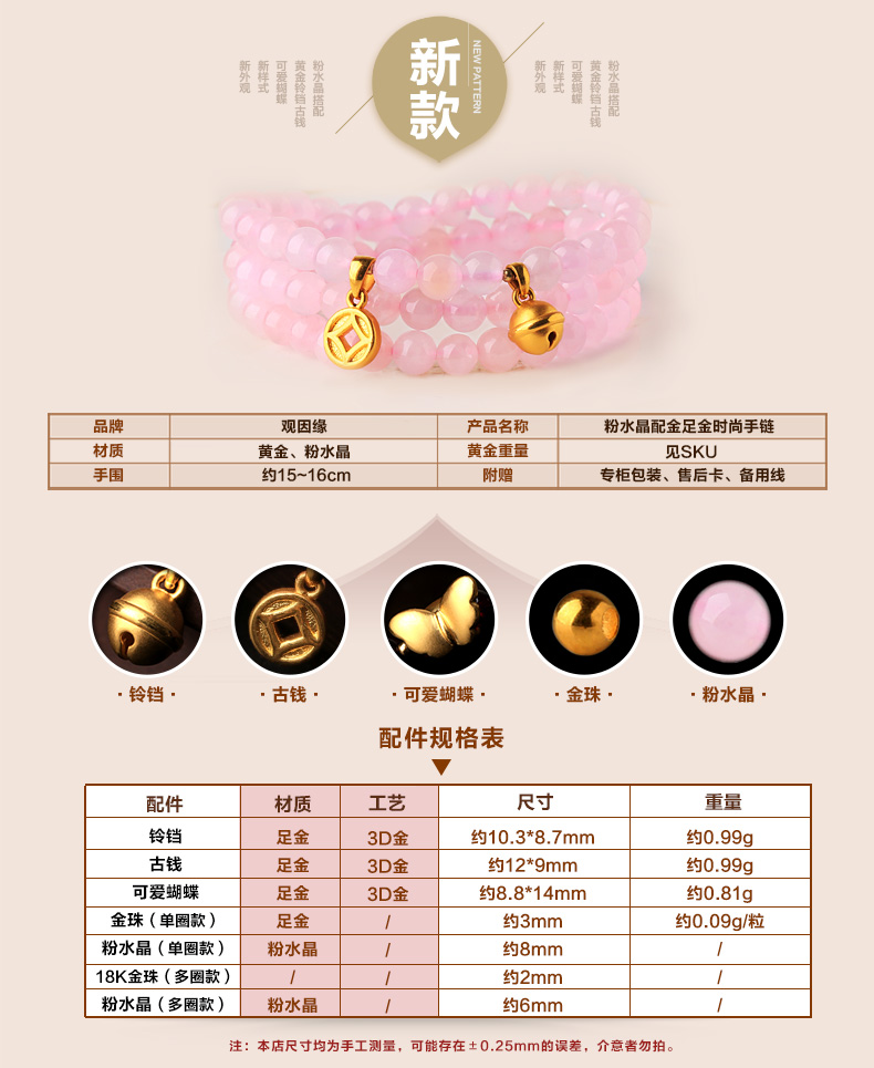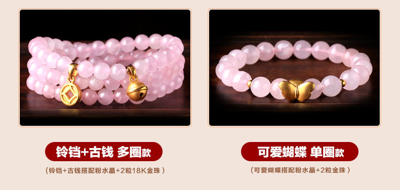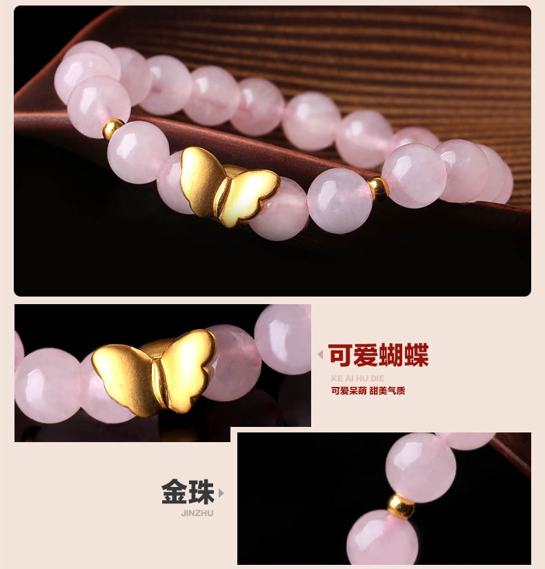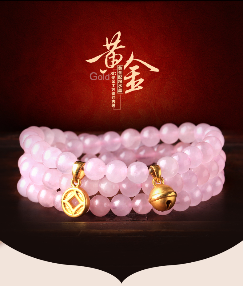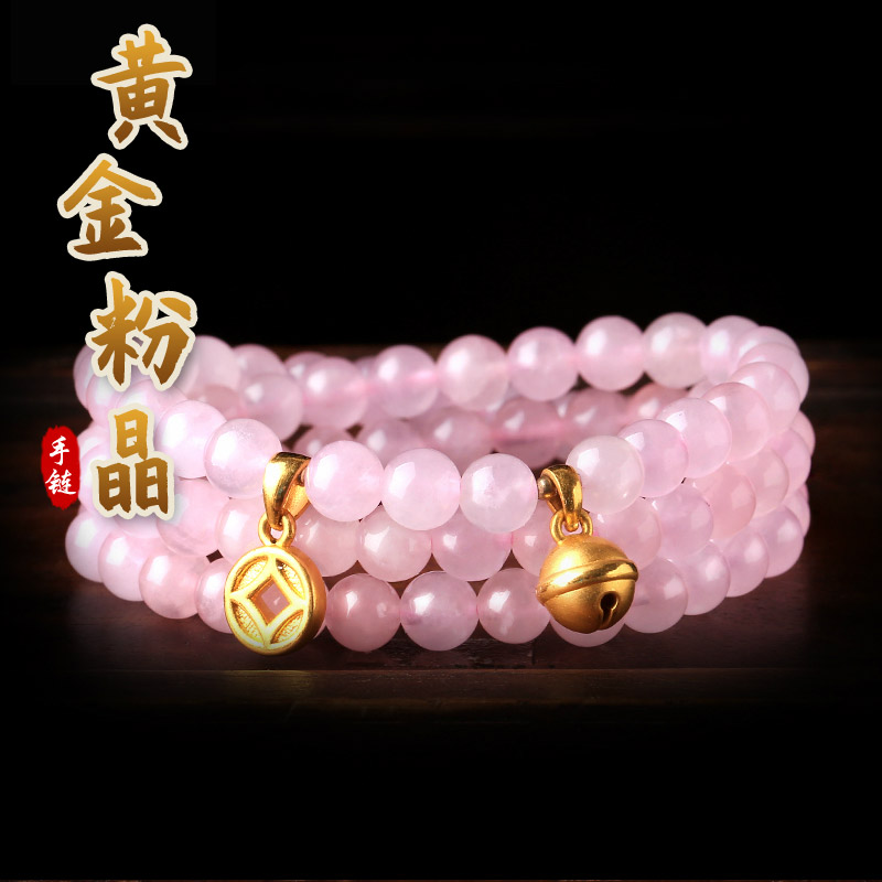 粉水晶配黄金足金3D硬金多种配饰手链★天然粉水晶单圈多圈手串★流行时尚