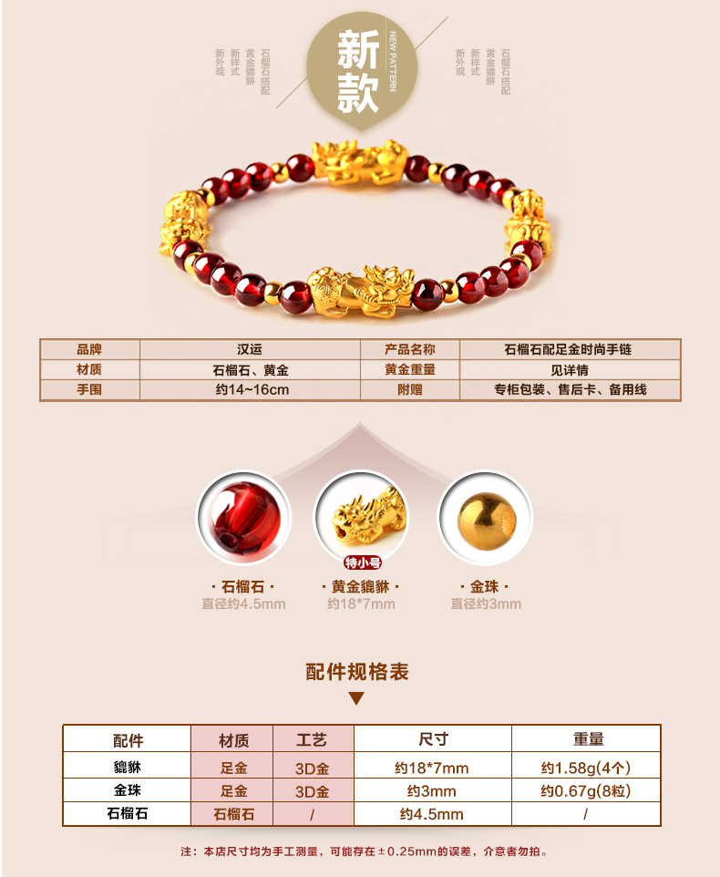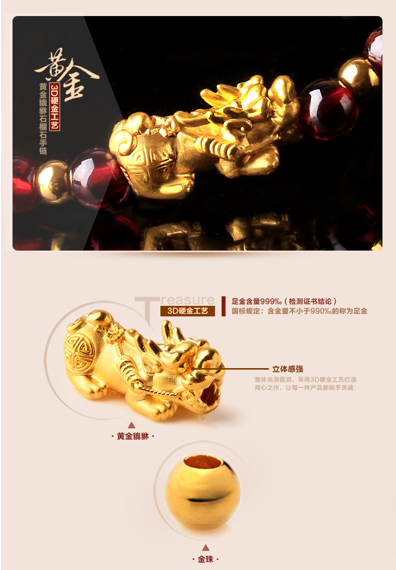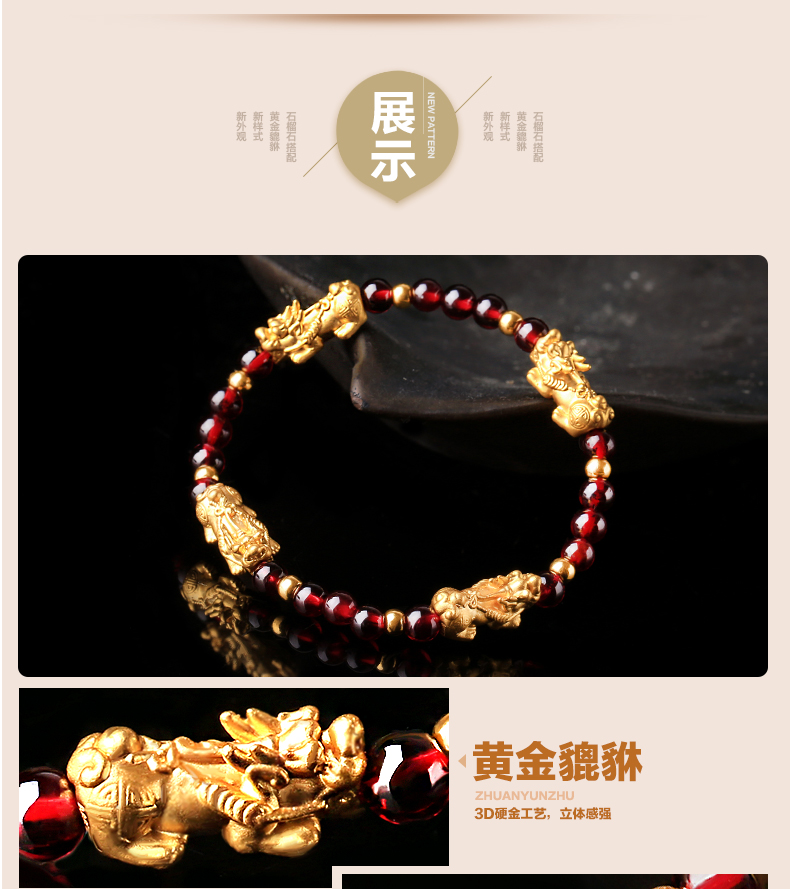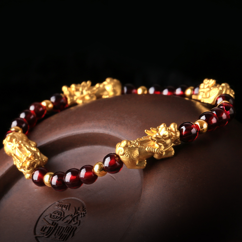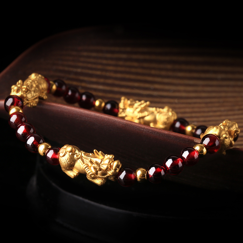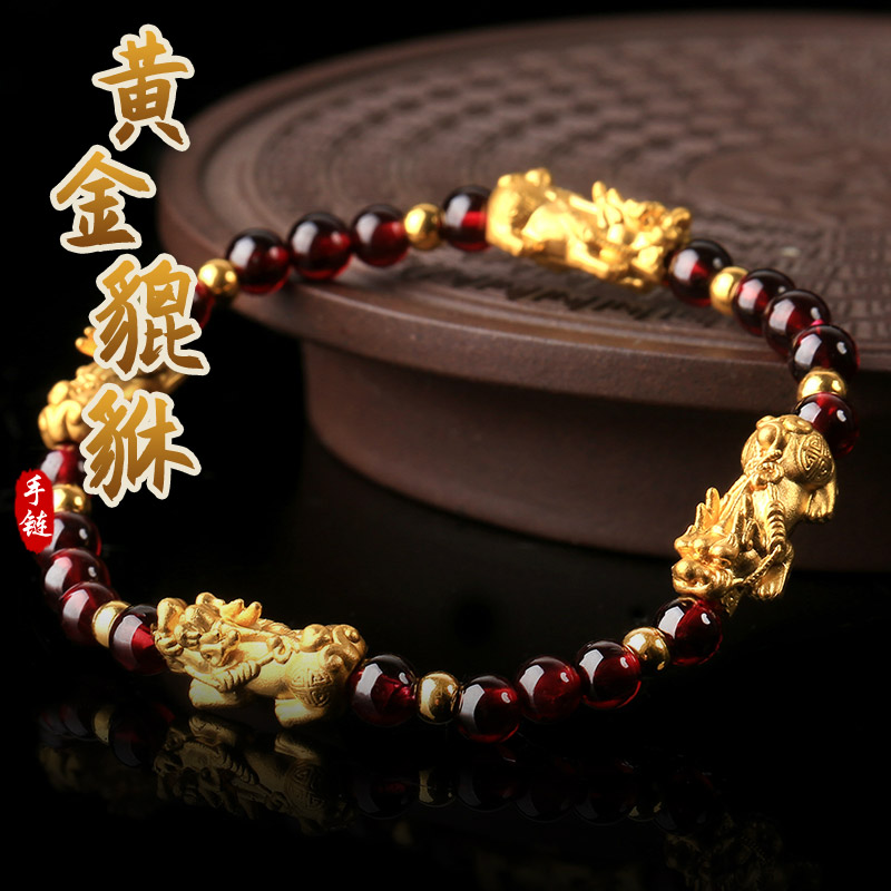 石榴石配足金黄金貔貅手链★3D硬金工艺单圈手链流行饰品