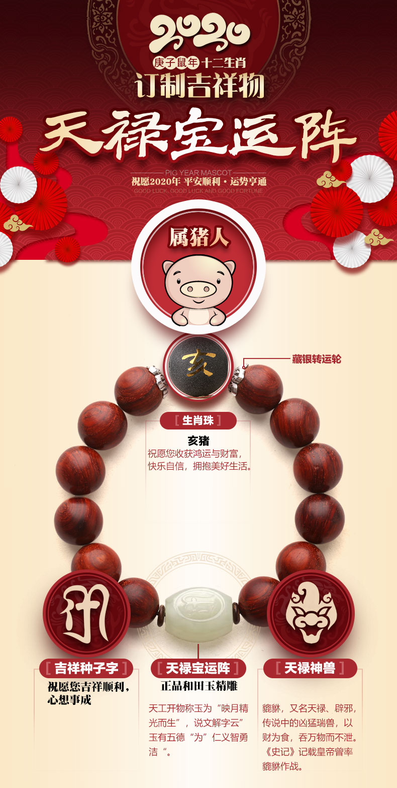 属猪人2020鼠年生肖吉祥物★流年天禄宝运阵手链男款★和田玉配黑曜石沉香小叶紫檀多款可选
