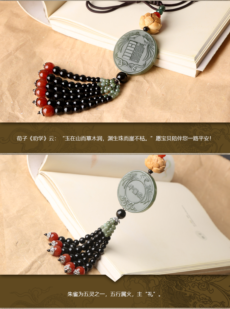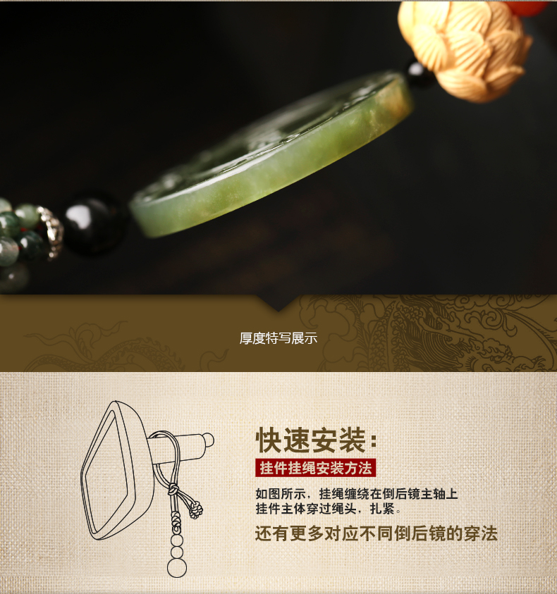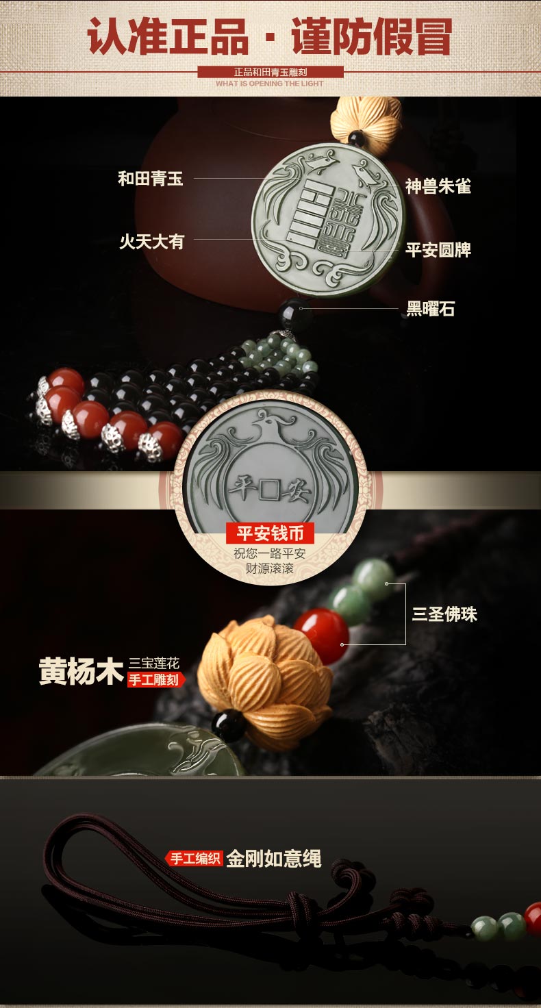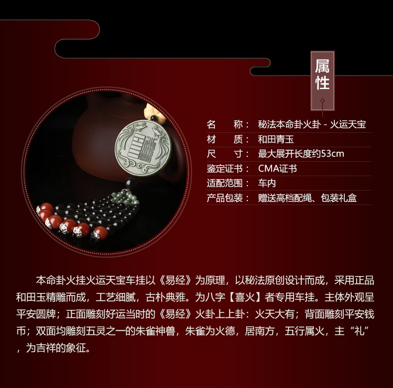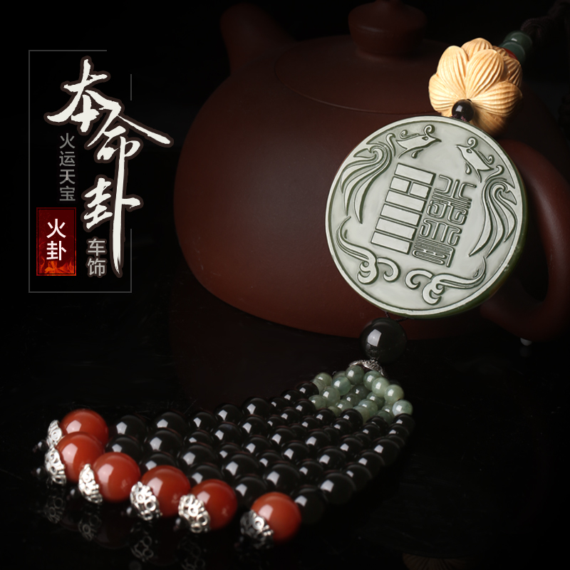 本命卦车挂以《易经》为原理,以秘法原创设计而成,采用正品和田玉精雕而成,工艺细腻,古朴典雅。根据八字选择,主体外观呈平安圆牌;正面雕刻三阳开泰的《易经》金、木、水、火、土卦象;背面雕刻平安钱币;双面均雕刻五灵之一的白虎、青龙、玄武、朱雀、麒麟神兽,为吉祥的象征。