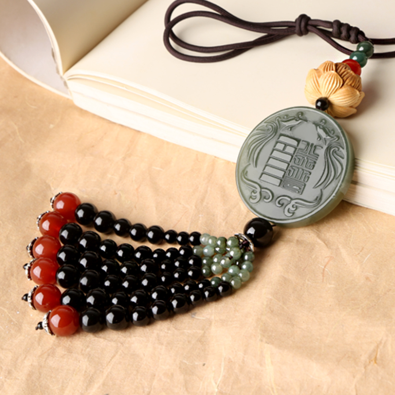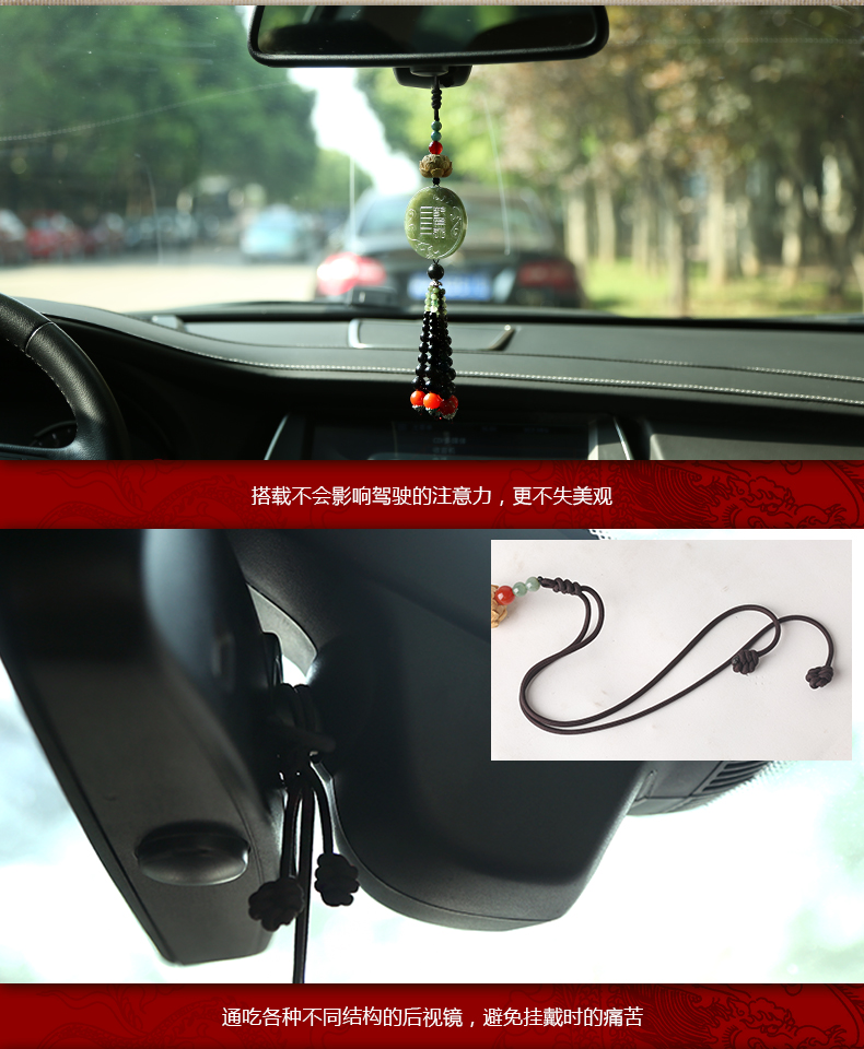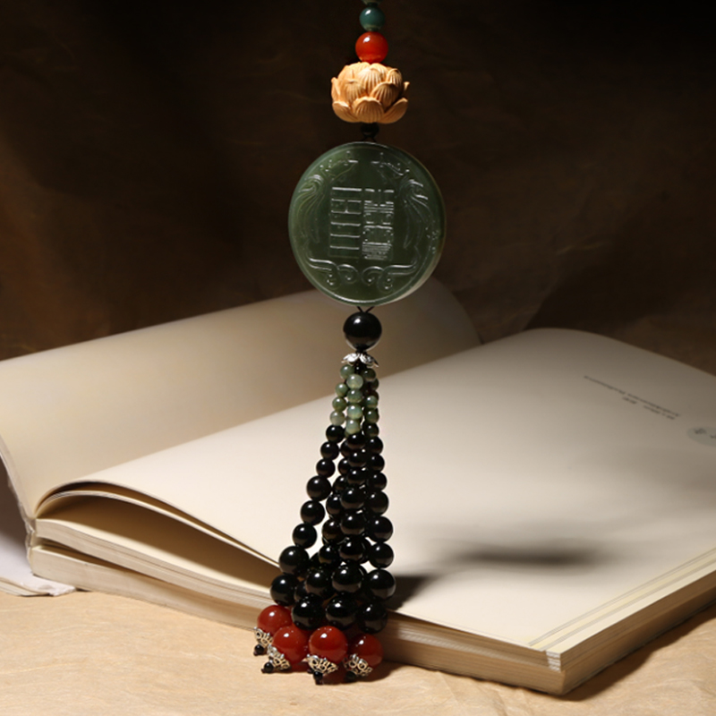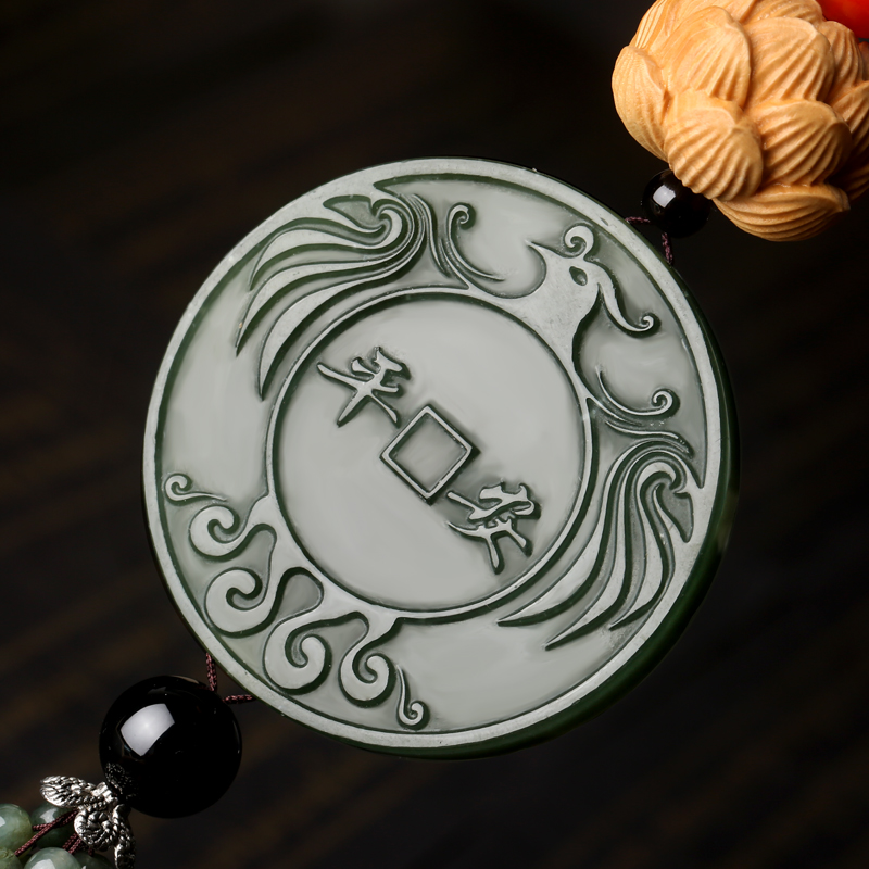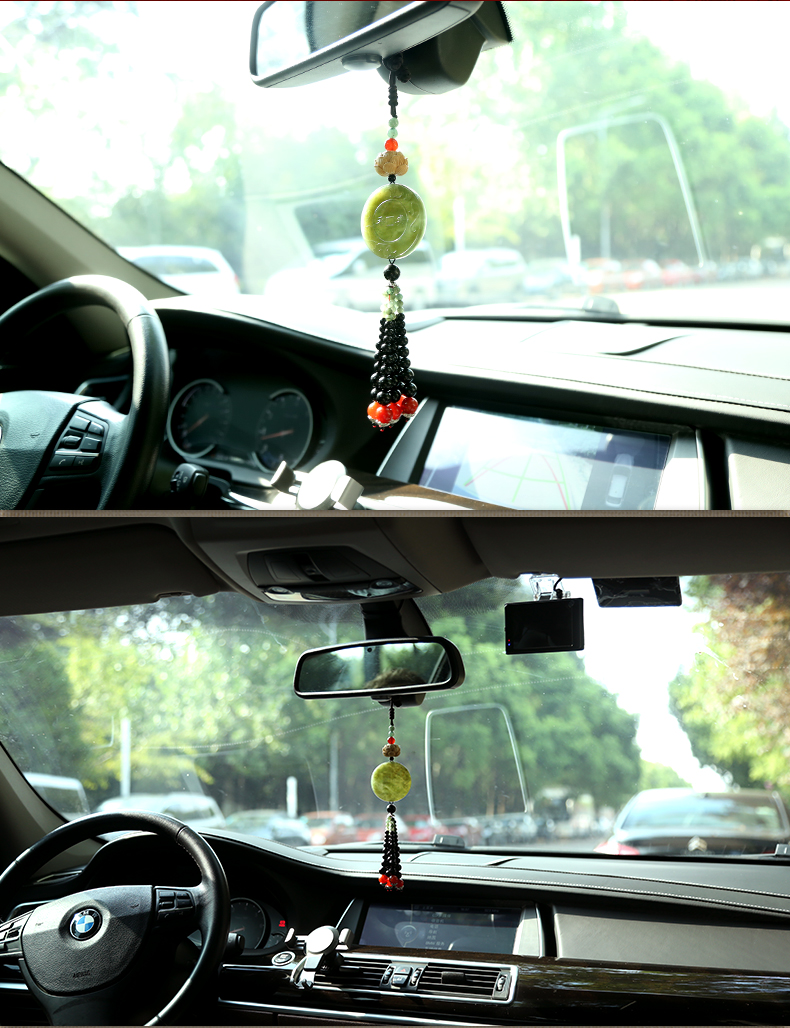 本命卦车挂以《易经》为原理,以秘法原创设计而成,采用正品和田玉精雕而成,工艺细腻,古朴典雅。根据八字选择,主体外观呈平安圆牌;正面雕刻三阳开泰的《易经》金、木、水、火、土卦象;背面雕刻平安钱币;双面均雕刻五灵之一的白虎、青龙、玄武、朱雀、麒麟神兽,为吉祥的象征。