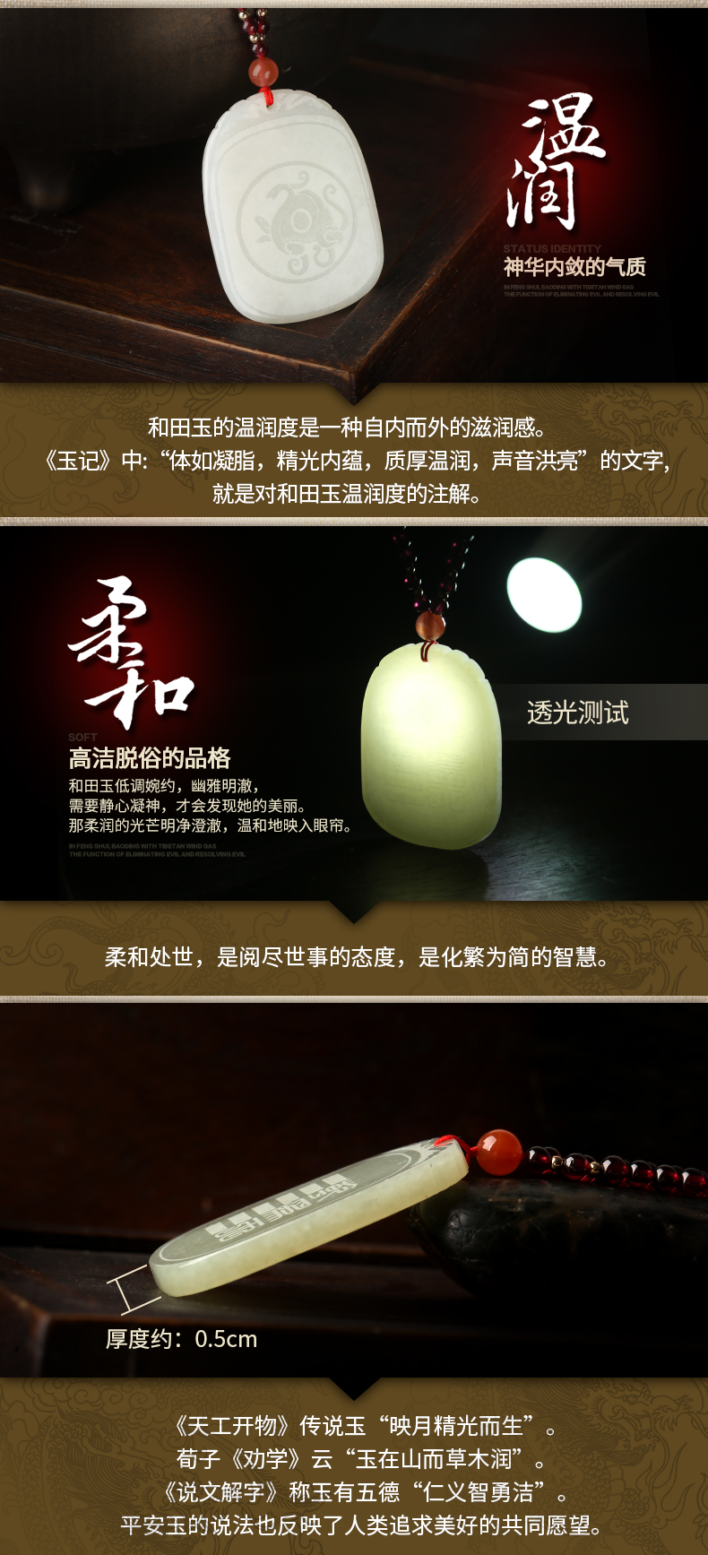 和田玉是属于软玉,属透闪石类,硬度为6-6.5度,比重为2.96-3.17。和田玉温润晶莹,质地细腻,给人以一种刚中见柔的感觉。和田玉呈纤维交织结构,一般油脂或蜡状光泽,总体呈微透明或半透明状。