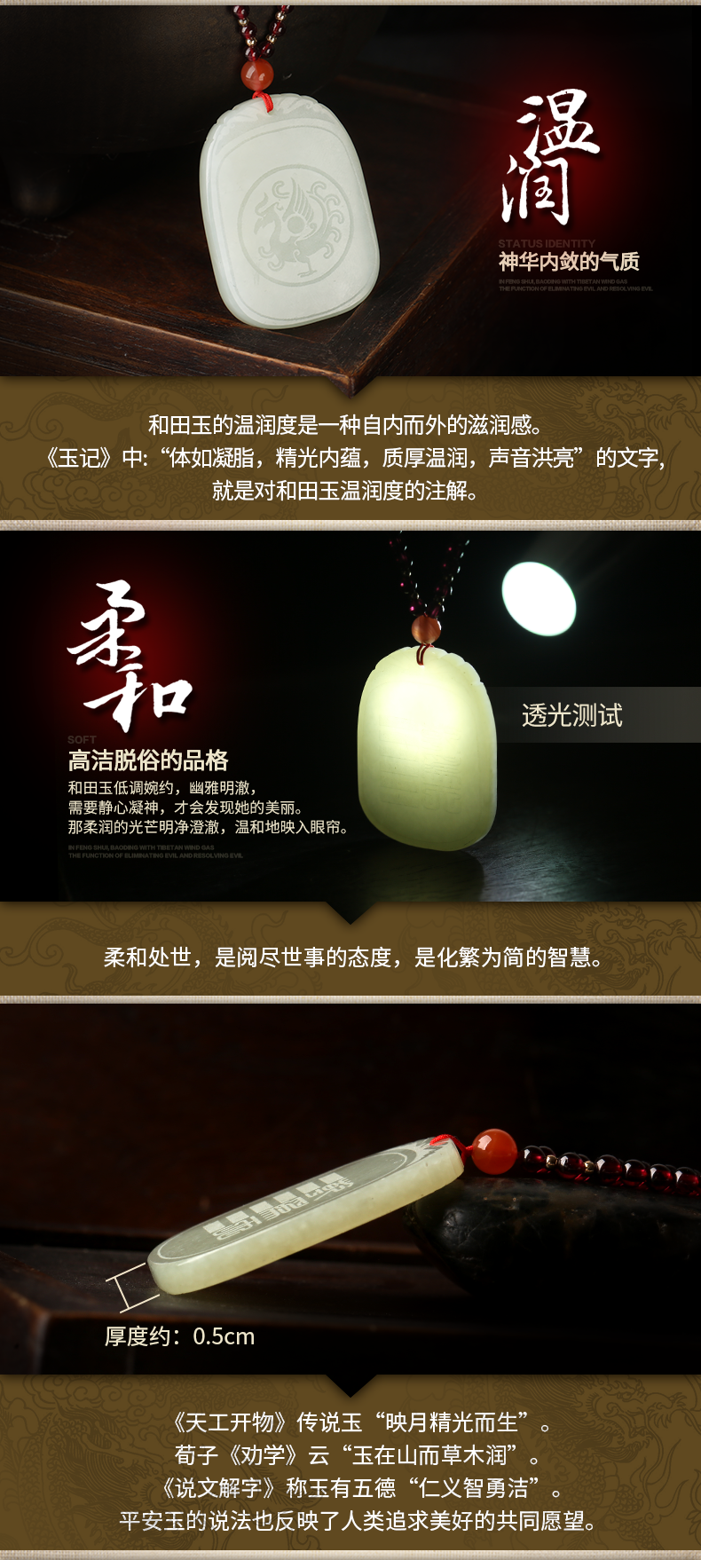 和田玉是属于软玉,属透闪石类,硬度为6-6.5度,比重为2.96-3.17。和田玉温润晶莹,质地细腻,给人以一种刚中见柔的感觉。和田玉呈纤维交织结构,一般油脂或蜡状光泽,总体呈微透明或半透明状。