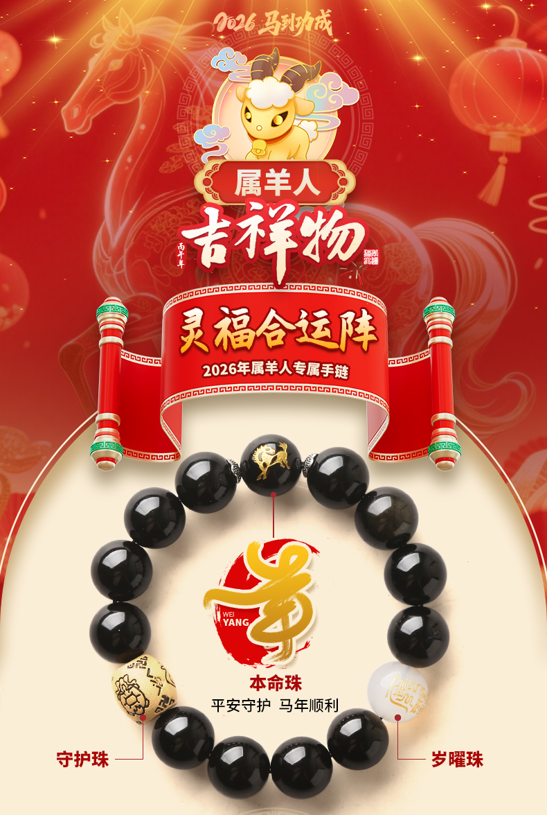 属羊人2026年马年生肖吉祥物手链男款★灵福合运阵★玛瑙黑曜石沉香紫檀木多款本命年犯太岁