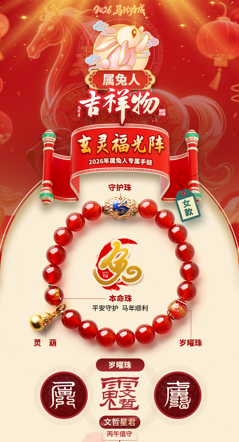属兔人2026年马年生肖吉祥物手链女款★玄灵福光阵★红玛瑙紫水晶朱砂沉香多款本命年犯太岁