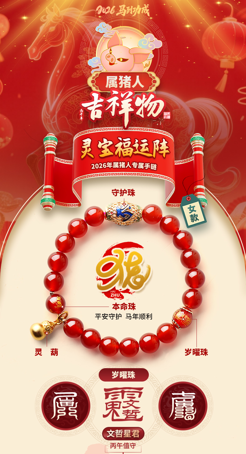 属猪人2026年马年生肖吉祥物手链女款★灵宝福运阵★红玛瑙紫水晶朱砂沉香多款本命年犯泰岁