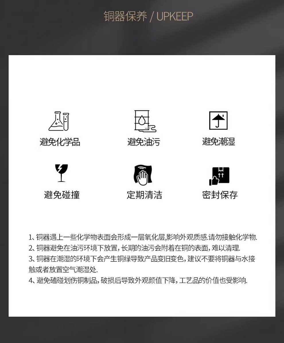 铜铸工艺高度在10cm往上的大多是中空的,内壁可能会有模具残留。运输过程中会把内壁的残留的模具震落一部分。同时由于是铜汁浇注的难免会留下气孔沙眼,有细微的划痕沙眼,接口处略有缝隙,抛光色不均匀,铸造字迹不清楚等都属正常。
