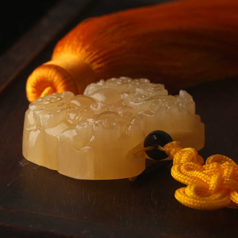 黄玉,又称米黄玉、黄金玉,具有油脂光泽或蜡状光泽,属于碳酸盐玉。黄玉的矿物组成主要以白云石为主,伴有少量方解石和少量石英。其摩氏硬度4.3~4.5,密度2.6~2.9。色调柔和滋润,不透明至微透明,质地细腻。黄玉作为一种显贵颜色的象征,其制作的工艺品造型精美、寓意吉祥,但价格却平易近人,性价比极高,是家居易于保存,不易褪色,适合永久收藏。